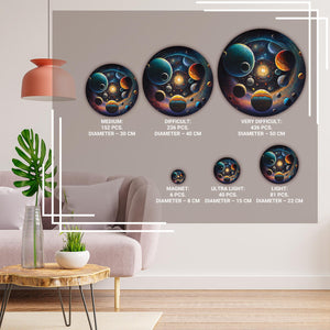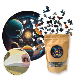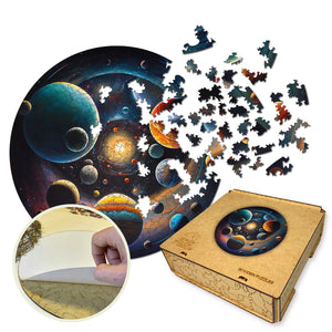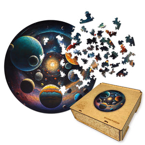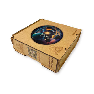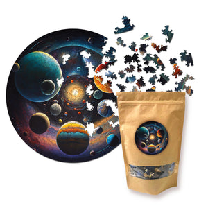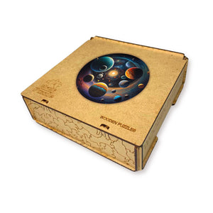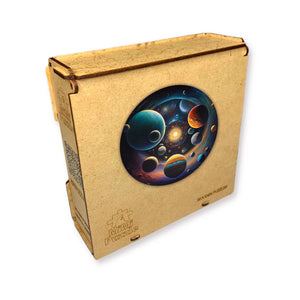 These eco-friendly wooden puzzles will allow you to spend enjoyable hours solving an engaging puzzle with your friends. The puzzles are designed in the form of a picture that depicts the universe with its multitude of planets and stars, entitled "Travel through the Universe." Each planet has its unique color and shade, which creates a beautiful contrast against the dark background of space. Large planets with their big rings and satellites, small planets with their bright surfaces and crater-like indentations, their diversity and beauty add depth and life to the picture. Stars of different sizes and brightness are scattered throughout space, creating a picturesque landscape.